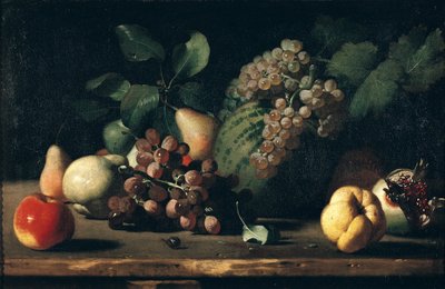 Stillleben mit Wassermelone, Trauben, Pflaumen, Pfirsichen, Kirschen und anderem Obst auf einem Sims(Still Life of Water Melon, Grapes, Plums, Peaches, Cherries and other Fruit on a Ledge)Abraham Brueghel |