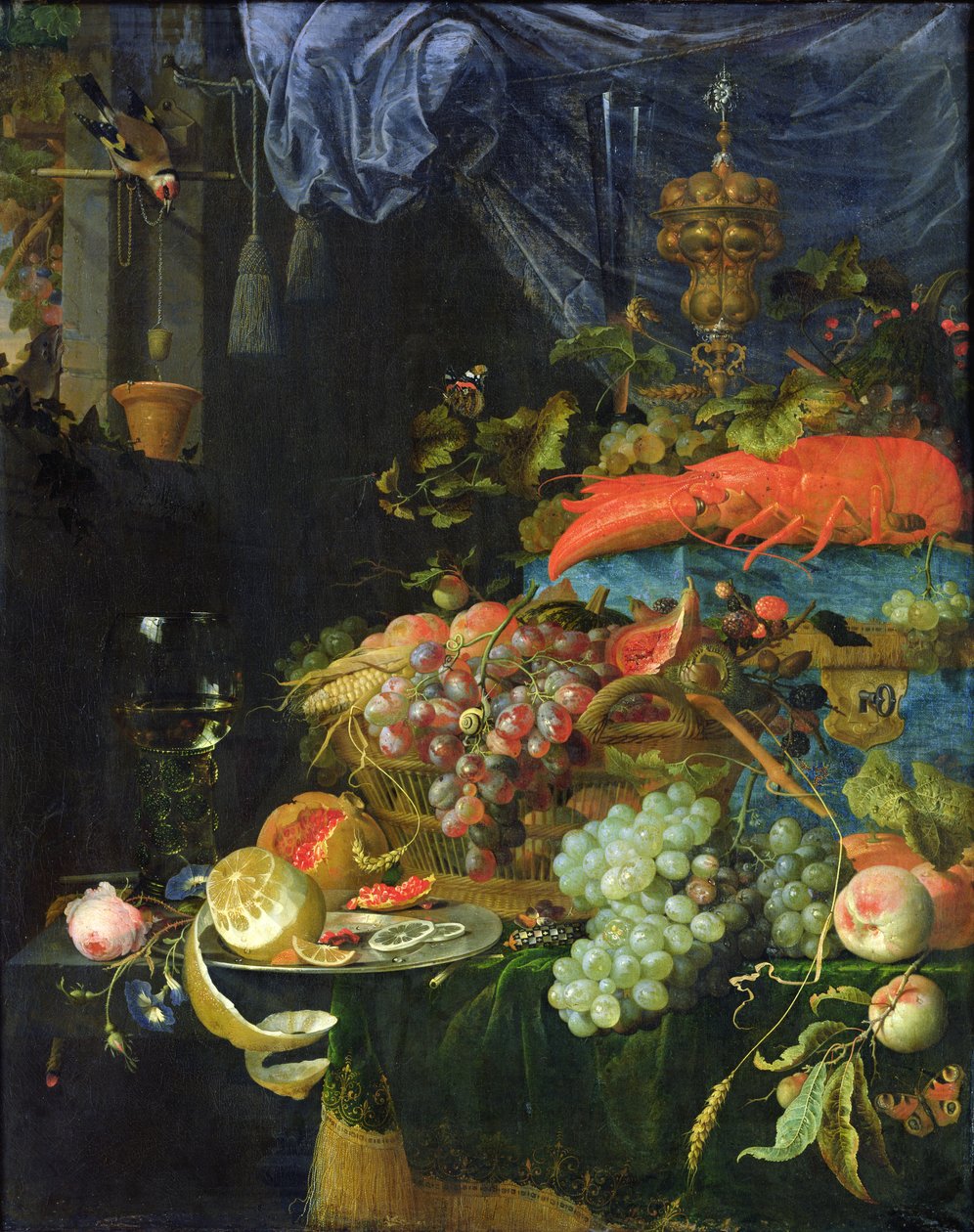 stillleben · obst · früchte · essen · hummer · meeresfrüchte · ein paar trauben · trauben · apfel · Äpfel · zitrone · granatapfel · schmetterling · schmetterlinge · glas · wein · Musee de la Chartreuse, Douai, France / Bridgeman Images