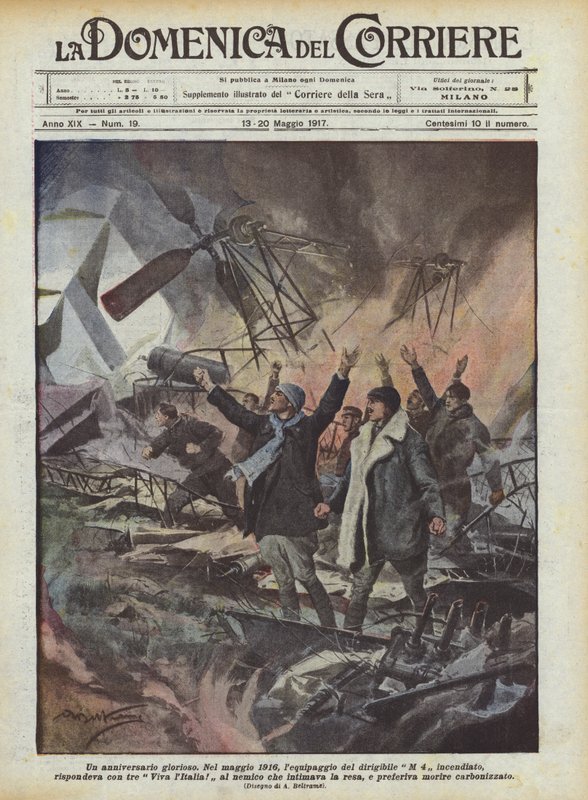 italien · italienisch · erster weltkrieg · der erste weltkrieg · zeppelin · luftschiff · luftschiff · ballon · absturz · katastrophe · abgestürzt · propeller · trümmer · feuer · flammen · verbrennung · brennen · jubel · winken · schreien · flieger · pilot · piloten · flug · fliegend · nacht · Jahrestag · Private Collection / Bridgeman Images · / Look and Learn |