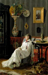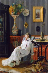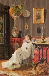 19. jahrhundert · 19. jahrhundert · xix. jahrhundert · xix. jahrhundert · neunzehntes jahrhundert · 19.jh. · 19 19. xix. innenarchitektur · malerei des 19. jahrhunderts · kunst · jahrhunderte · entspannung · schlaf · ganze länge · kunstmalerei · zeitgenössisches alter · italien · vertikale · 19. jahrhundert · innenräume · beine über den knien gekreuzt · augen geschlossen · porträt · schlafen · sitzen · schlafen · kleidung · kleidung · literarische und künstlerische strömungen und bewegungen · nur eine junge frau · europa · eine person · illustration und malerei · malerei · belimbau adolfo · vase · orientalismus (ab 1798) · florenz palazzo pitti (palazzo pitti) galleria d' · arte moderna (galerie der modernen kunst) · Adolfo Belimbau · Exotik (aus der zweiten Hälfte des 17. Jahrhunderts) · Galleria d'Arte Moderna, Palazzo Pitti, Florence, Tuscany, Italy / Bridgeman Images