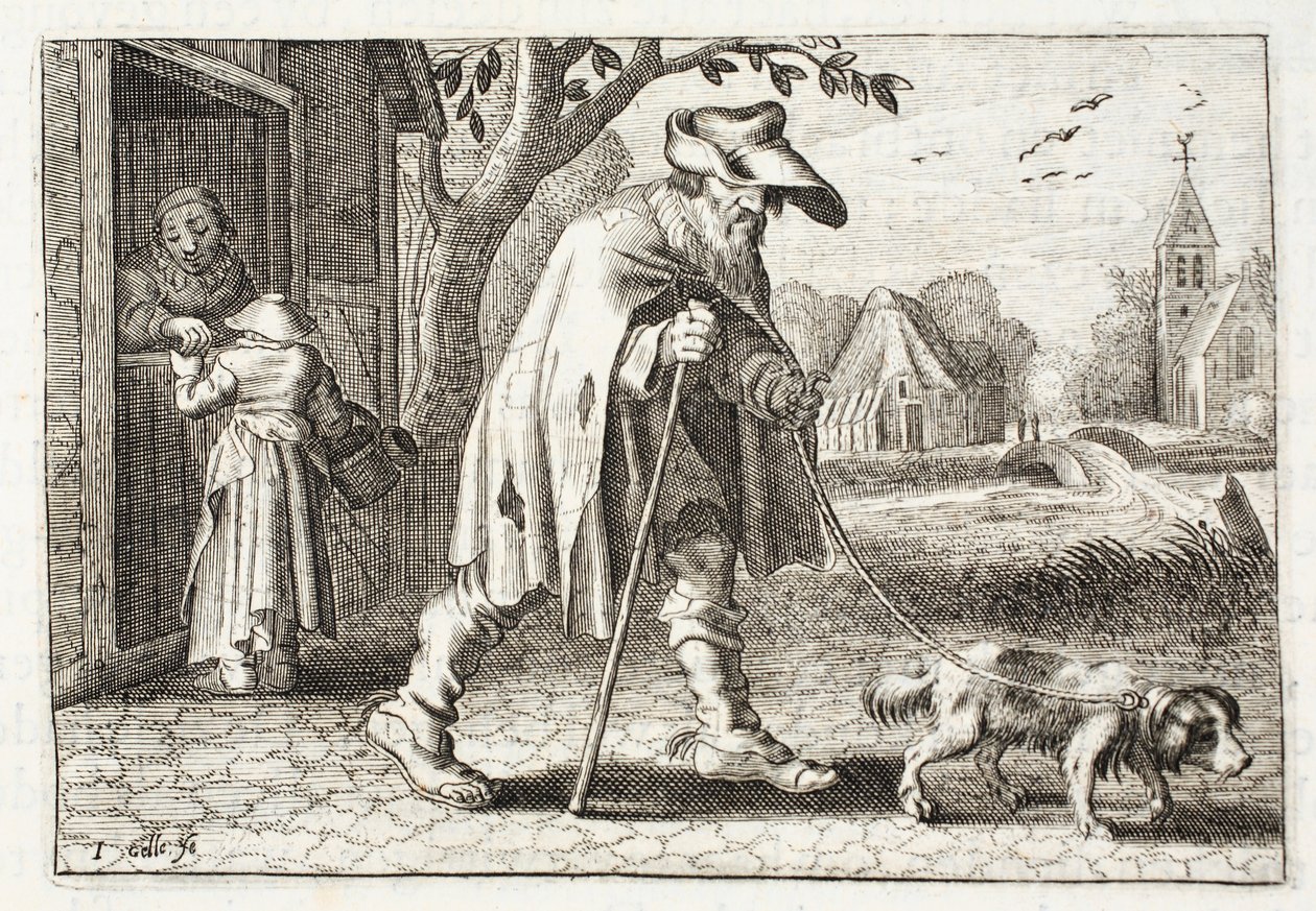 emblemata of zinnewerk · liebesembleme · emblem · illustration · vignette · tracht · tracht · szenen der lachenden welt · niederländisches goldenes zeitalter · c17th · satire · satirisch · hund · armut · führen · dorf · stadt · dorf · kind · betteln · bettler · Bettler · Private Collection / Bridgeman Images |