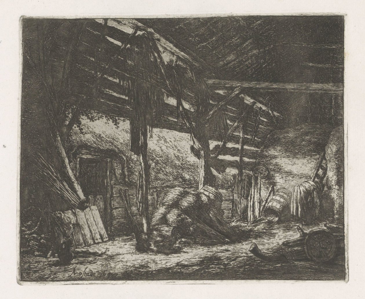Innenraum einer Heuscheune(Interieur van een hooischuur)Adriaen van Ostade(print maker),Adriaen van Ostade(after own design by) |