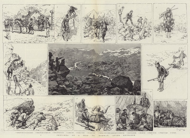 skizzen · ausflug · norwegen · rentier · verlassen · bauernhof · portion · pony · rutschig · fels · felsen · rahmen · zelt · gefährlich · gehen · kreuzung · strom · aufstieg · sichtung · herde · allgemeines · aspekt · berg · tops · schnee · rutschen · schuss · häuten · hirsch · warten · nacht · jagd · Schießen · Topographie · Private Collection / Bridgeman Images · / Look and Learn |