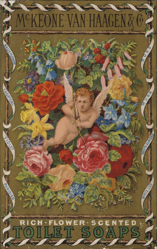 werbung · ephemera · cherub · flügel · bogen · blumen · farben · mckeone van haagen · unternehmen · duftend · duft · scanted · toilettenartikel · seife · toilettenseifen · Private Collection / Bridgeman Images · / Look and Learn |