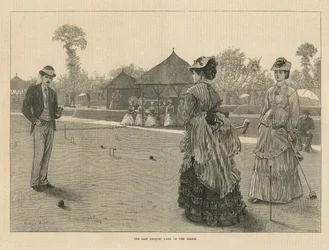 19. jahrhundert · englisch · gravur · gravuren · illustration · abbildungen · freizeit · sozial · geschichte · illustrierte londoner nachrichten · viktorianisch · sommer · rasen · krocket · spiel · spiele · spiel · streichhölzer · sport · sport · hammer · schlägel · spieler · spieler · Private Collection / Bridgeman Images · / Look and Learn