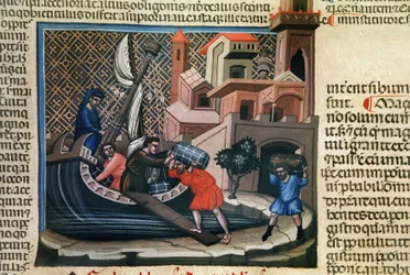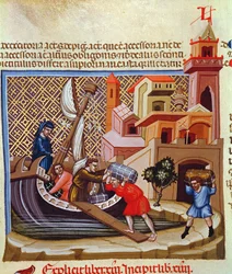 Warenverladung auf ein Schiff, aus dem Manuskript "Justiniano Institutiones Feodorum et Alia", ca. 1300(Loading Goods on to a Ship, from the manuscript "Justiniano Institutiones Feodorum et Alia", c.1300)Bolognese School |