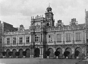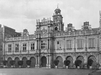 garten · gardens · land · haus · stattlich · zuhause · häuser · häuser · gartenarbeit · parks · villen · england · englisch · clock turret · südeingang · hatfield house · Private Collection / Bridgeman Images · / Look and Learn