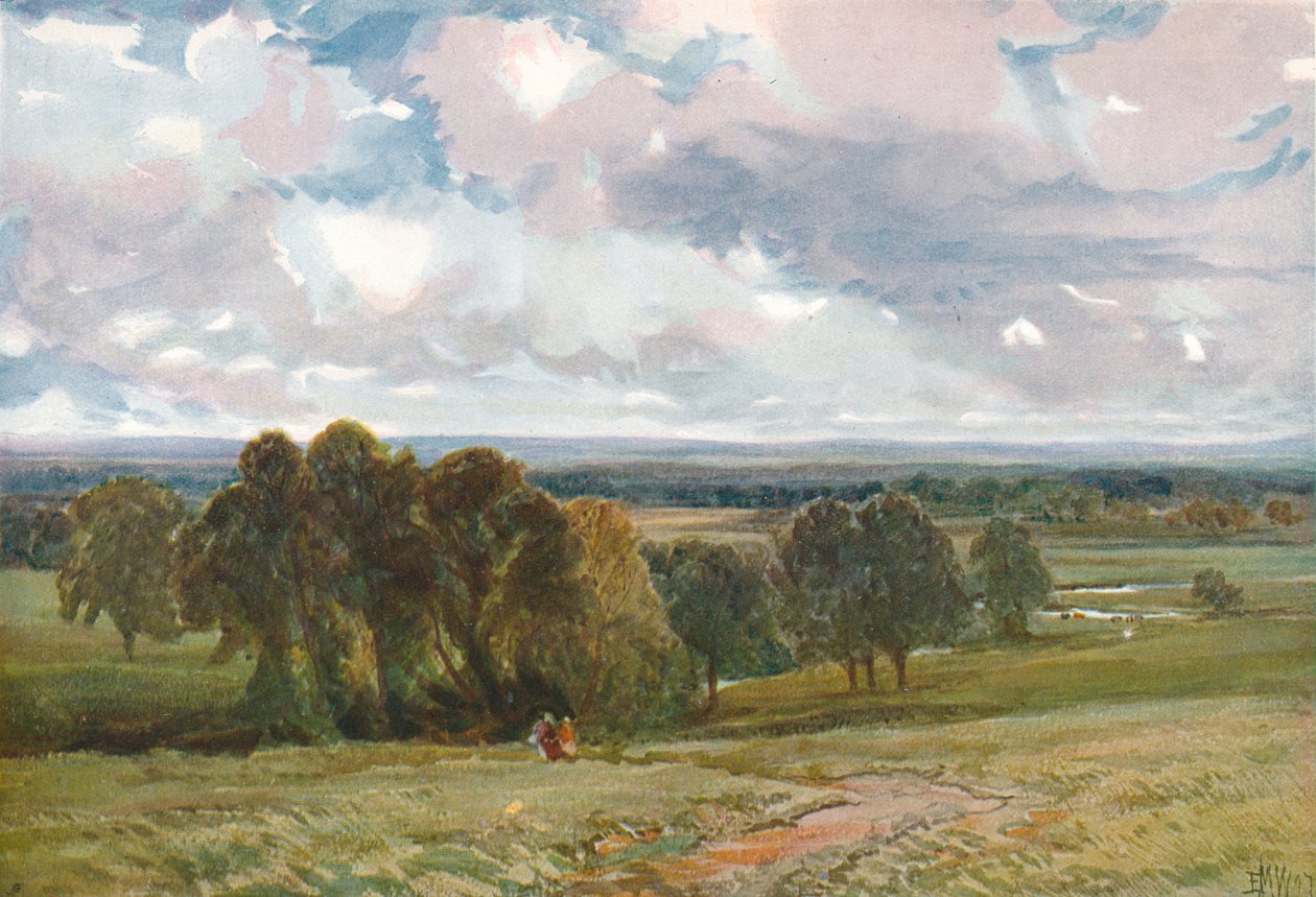 wetter · natur · außen · draußen · wolke · wolken · baum · landschaft · england · leute · gehen · betrieb · betriebe · anstrich · land · grün · britisch · beträchtlich · englisch · farbe · horizont · moorland · vastness · position · jahrhundert · großbritannien · sussex · machn sie fest · konzept · gestrüpp · wolke anordnung · abschweifend · farbe · hintergrundleute · 1900s · 20. jahrhundert · bäume · watercolour · landscape · charles · holme · charles holme · edmund morison wimperis · wimperis · edmund morison · edward morirson wimperis · the studio publications · the studio ltd · royal institute of painters · em wimperis · The Print Collector/Heritage Images |