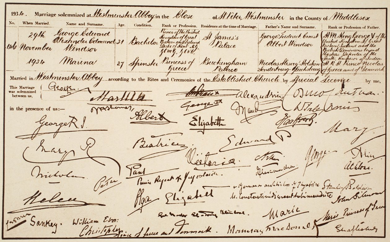 Die Heiratsurkunde des Herzogs und der Herzogin von Kent, 29. November 1934(The Wedding Certificate of the Duke and Duchess of Kent, 29th November 1934 )English Photographer |