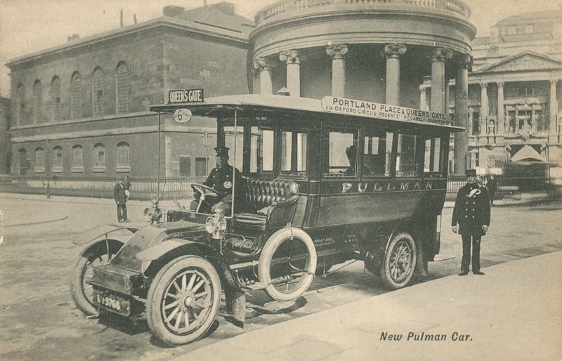london · postkarte · postkarten · karte · neues pullman auto · transport · gebäude · die architektur · omnibus · treiber · bewachen · Private Collection / Bridgeman Images · / Look and Learn |