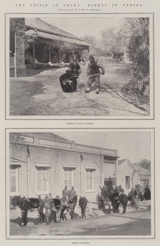 krise · china · szenen · peking · bewässerung · straßen · hotel de peking · peking · straßenszenen · traditionelles kleid · Private Collection / Bridgeman Images · / Look and Learn |