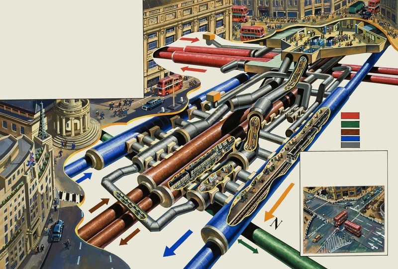 london · u-bahn · busse · züge · rolltreppen · unterirdische · straßen · Bahnhof · Taxi · Private Collection / Bridgeman Images · / Look and Learn |