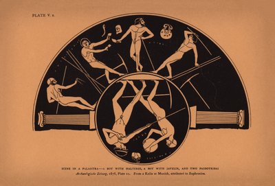 Antike griechische Erziehung: Szene in einer Palaistra, ein Junge mit Halteres, ein Junge mit Speer und zwei Paidotribai(Ancient Greek Education: Scene in a Palaistra, a boy with halteres, a boy with javelin, and two paidotribai (litho))English School |