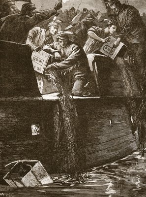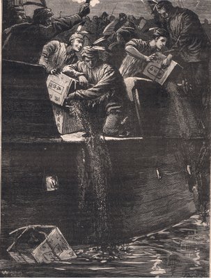 Bostoner 'Jungen' verkleidet als Indianer werfen die Teekisten in den Hafen, Illustration aus 'Cassell's Illustrated History of England'(Boston 'boys' disguised as Indians throwing the tea chests into the harbour, illustration from 'Cassell's Illustrated History of England' (engraving) (sepia photo))English School |