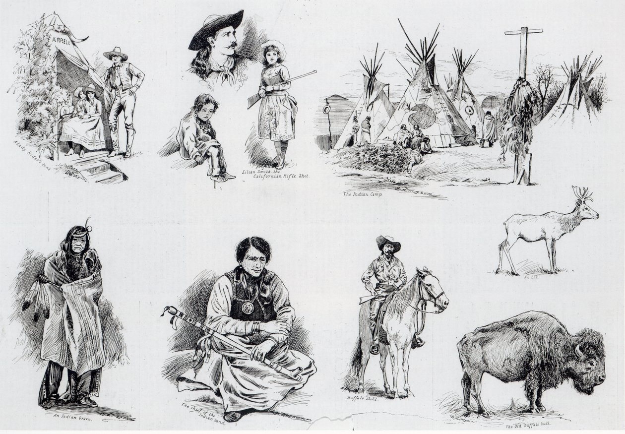 buffalo bill · porträt · mann · amerikanischer pfadfinder · cowboy · indianer · indianer · häuptling · lager · zelt · schausteller · porträts · tipi · abschlag · stier · elch · pferd · pferd · kostüm · pfeife · gewehr · indianer mutig · büffelbulle · amerika · amerikaner · Nordamerika · The Illustrated London News Picture Library, London, UK / Bridgeman Images |