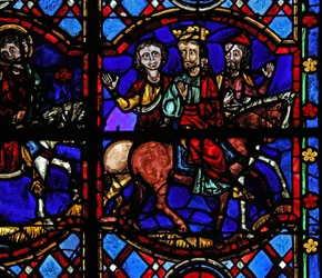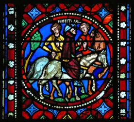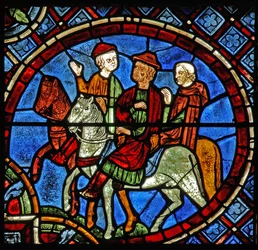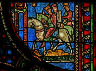 Detail eines der Bibelfenster, das die Magier zu Pferd zeigt, wie sie dem Stern folgen (Detail)(Detail from one of the Bible Windows depicting the Magi on horseback following the star )English School |