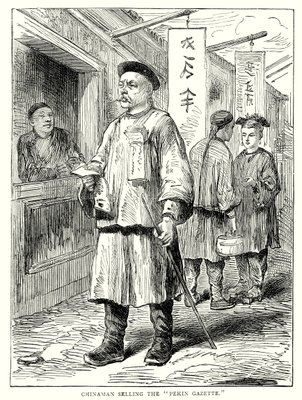 Chinese verkauft die Pekin Gazette, Illustration aus Cassells Illustrierter Geschichte Englands(Chinaman selling the Pekin Gazette, illustration from Cassells Illustrated History of England )English School |