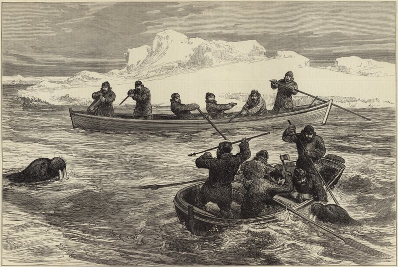 die pandora-arktis · pandora arktis · expedition · arktis · tierwelt · walross · jagd · schießen · boote · männer · menschen · tiere · wilde tiere · Private Collection / Bridgeman Images · / Look and Learn |