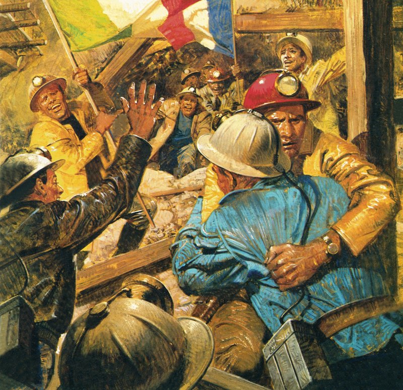 bau des mont-blanc-tunnels · frankreich · italien · graf dino totino · französische und italienische flaggen · grüße · zwei Enden verbunden · Private Collection / Bridgeman Images · / Look and Learn |