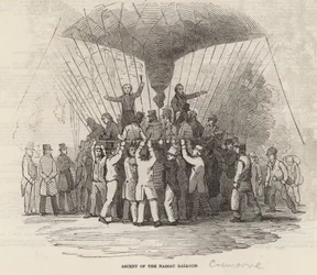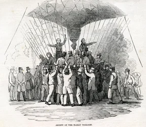 fliegend · maschine · kleidung · mode · cremorne gardens · königliche gärten · london · menge · ballonfahren · neuheit · luftfahrt · viktorianisch · heißluftballon · pionierarbeit · korb · Private Collection / Bridgeman Images