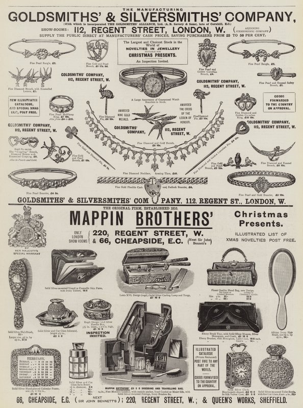geldbörsen · mappin-brüder · uhren · anzeigenseite · armbänder · anstecknadeln · ringe · goldschmiede · tintenfass · armreifen · schmuck · handtaschen · flaschen · broschen · haarbürsten und silberschmiede · Private Collection / Bridgeman Images · / Look and Learn |