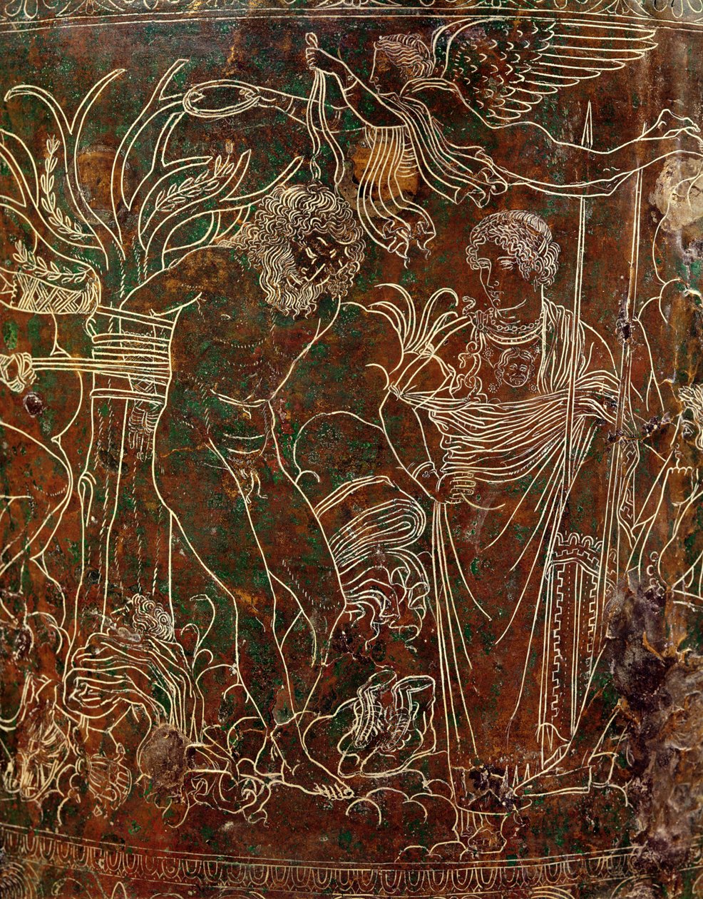 Amycus an einen Baum gebunden von Pollux, Detail von der Ficoroni-Cista, aus Palestrina, ca. 320 v. Chr.(Amycus tied to a tree by Pollux, detail from the Ficoroni Cista, from Palestrina, c.320 BC (bronze))Etruscan |