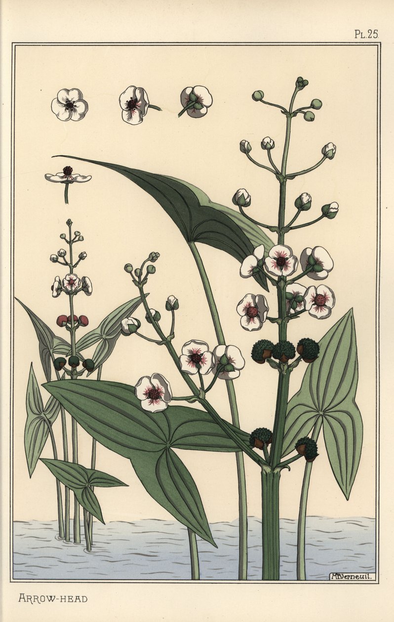 Botanische Illustration des Pfeilkrauts, Sagittaria sagittifolia(Botanical illustration of the arrowhead, Sagittaria sagittifolia)Eugene Grasset |