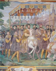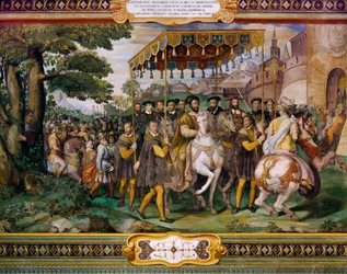 Der feierliche Einzug von Kaiser Karl V., Franz I. und Alessandro Farnese in Paris im Jahr 1540, aus der 'Sala dei Fasti Farnese', 1557-66(The Solemn Entrance of Emperor Charles V, Francis I and Alessandro Farnese to Paris in 1540, from the 'Sala dei Fasti Farnese', 1557-66 )Federico Zuccaro |