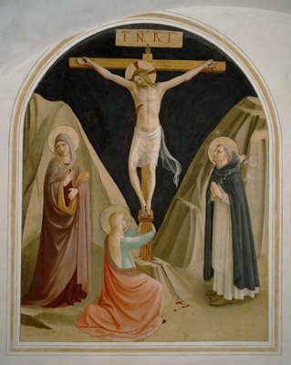 Kreuzigung mit der Jungfrau Maria und dem heiligen Dominikus. Inschrift "INRI" am Kreuz(Crucifixion with the Virgin mary saint Dominic. Inscription "INRI" on the cross)Fra Angelico |
