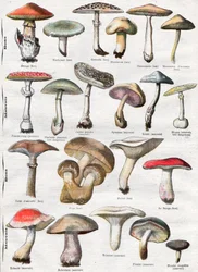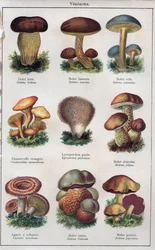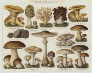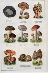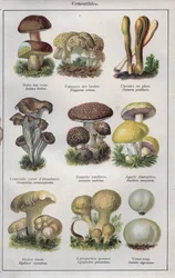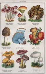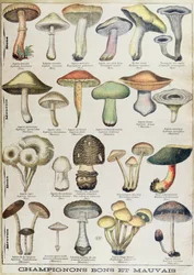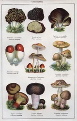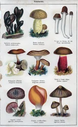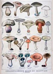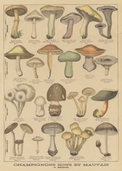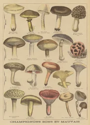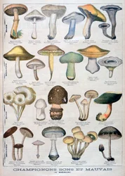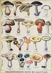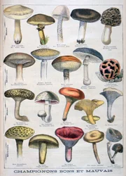 Botanische Tafel, die 'Gute und Schlechte Pilze' darstellt, ca. 1900(Botanical plate depicting 'Good and Bad Mushrooms', c.1900 (colour litho))French School |