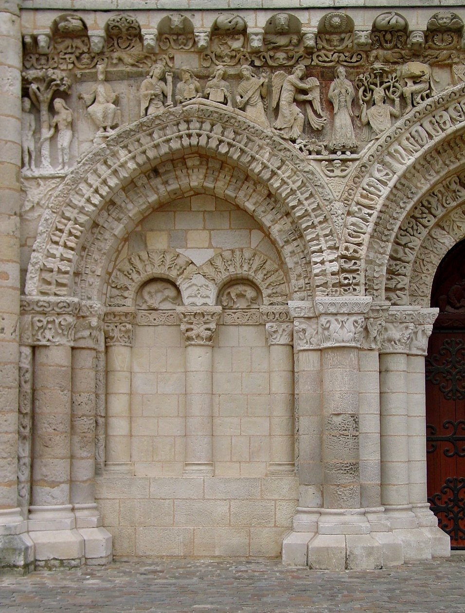 detail · bogen · Äußeres · schnitzen · geschnitztes · mittelalterliches · romanisches · 12. jh. · genesis · adam und eva · jesse-baum · figuren · relief · altes testament · Notre Dame la Grande, Poitiers, France / Bridgeman Images