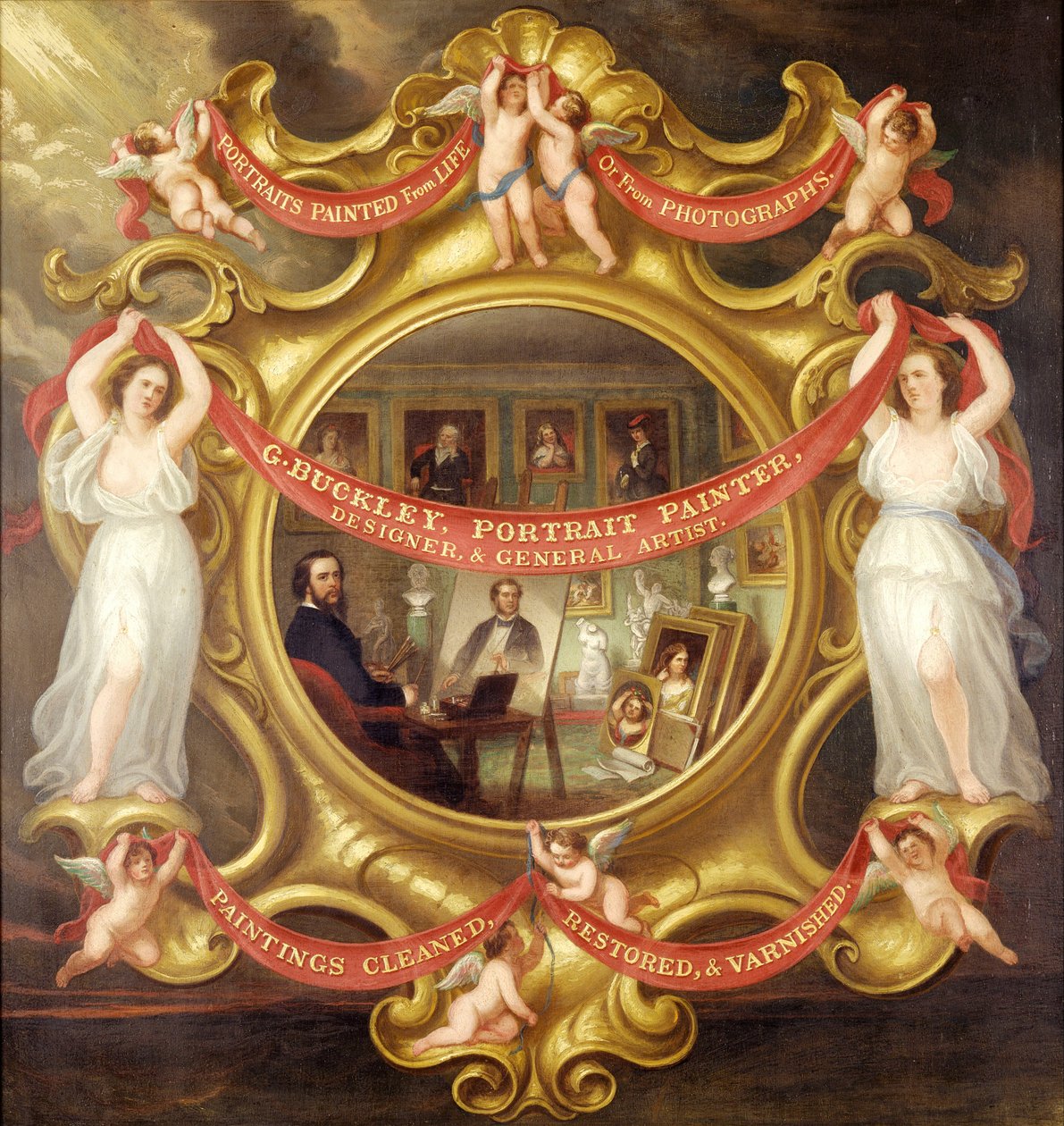 frauen · brüniert · künstler · cherub · werbung · gold · rahmen · scrollwerk · fließend · malerei · schilder · werbung · maler · Buckley