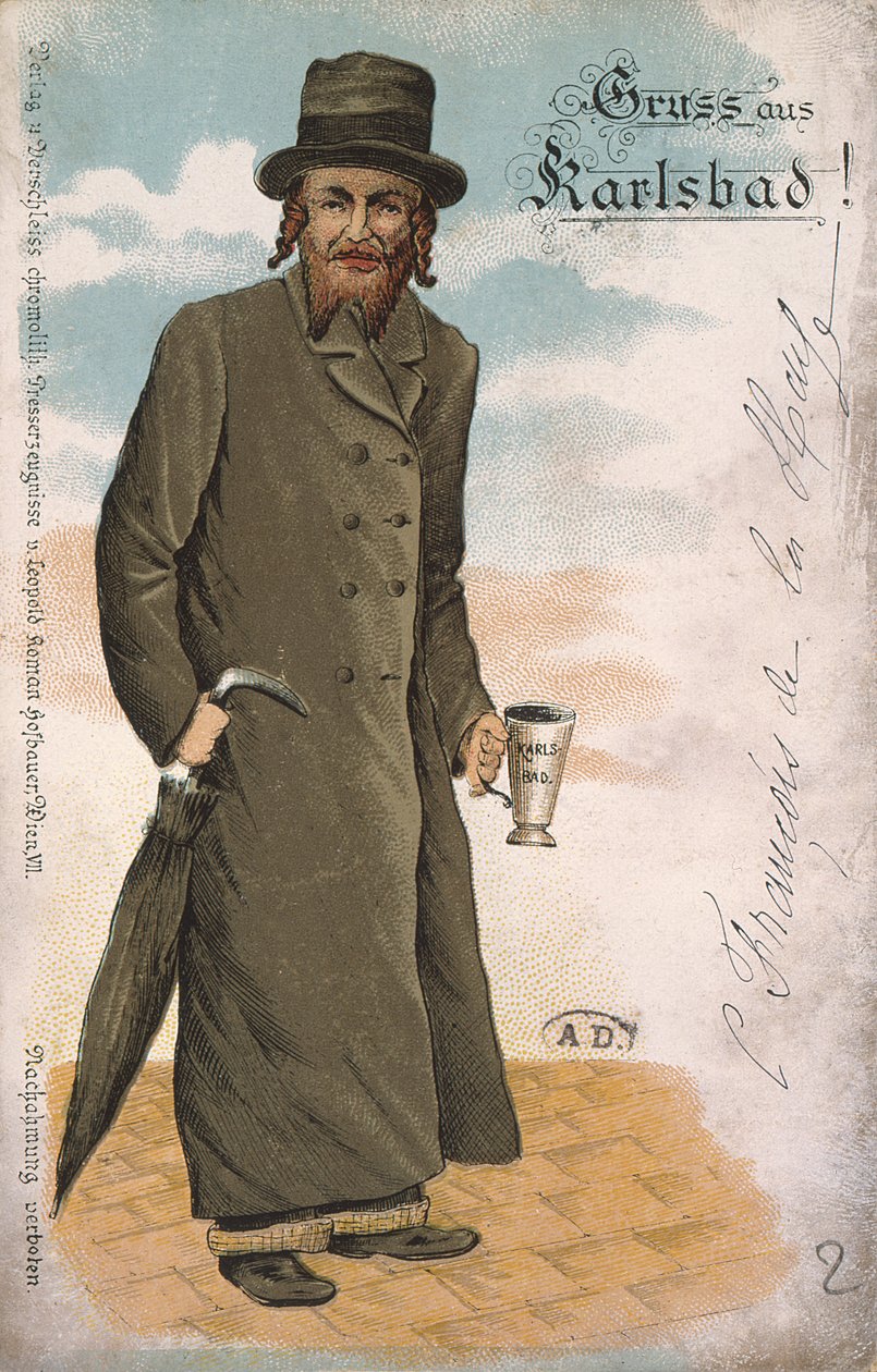 'Grüße aus Karlsbad', Souvenir-Postkarte aus dem Kurort Karlsbad, die einen Juden in traditioneller Kleidung und Haartracht zeigt, der eine Tasse für Mineralwasser hält, Ende des 19. Jahrhunderts (Farblithografie)('Greetings from Karlsbad', souvenir postcard from the spa of Karlsbad depicting a Jew with traditional dress and hair and holding a cup for drinking mineral wate,. late 19th century (colour litho))German School |