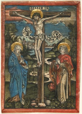 Christus am Kreuz mit Maria und Johannes, um 1470-80(Christ on the Cross with Mary and Saint John, c.1470-80 (hand-coloured woodcut on parchment))German School |