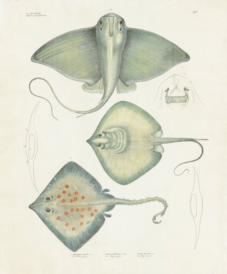 Seltsame Rochen(Strange rays (coloured engraving))German School |