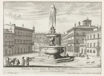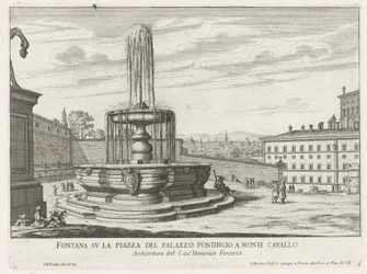 Brunnen auf der Piazza del Quirinale in Rom(Fontein op Piazza del Quirinale te Rome Fontana su la piazza del Palazzo Pontificio a Monte Cavallo (title on object) Fontane di Roma (series title) Fonteinen van Rome (series title))Giovanni Battista Falda(print maker),Giovanni Battista Falda(after own design by),Giovanni Giacomo de'Rossi(publisher) |
