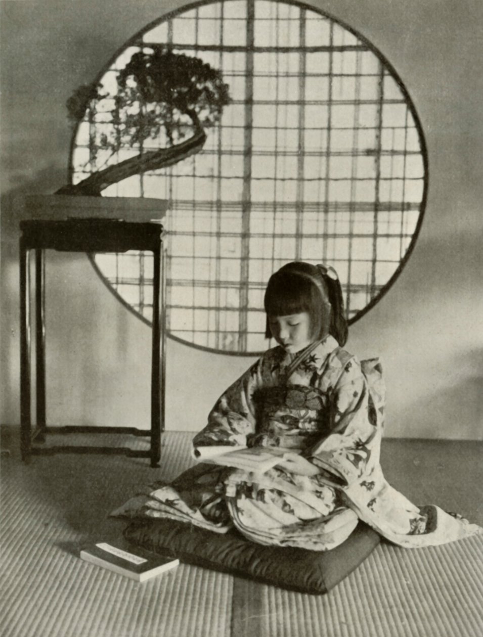 natur · freizeit · baum · frau · leute · kindheit · mädchen · mädchen · innen · schauen · asiatisch · asien · haupt · orientalisch · betrieb · betriebe · künste · land · form · fenster · buch · messwert · kontinent · traditionell · japan · japanisch · gestreift · position · kreisförmig · jahrhundert · kissen · fußboden · nach innen · bodenbelag · frisur · literatur · konzept · typisch · unten schauen · eine person · einfarbig · frisur · bonsais · frisur · abbildung buch · tägliches leben · zuhause · schwarzes u. weiß · schwarzes und weiß · traditionelle kultur · 1910s · 20. jahrhundert · bäume · photograph · portrait · herbert ponting · macmillan · ponting · herbert · herbert george ponting · in lotus-land japan · macmillan publishers · publishers · macmillan publishers ltd · macmillan co · The Print Collector/Heritage Images