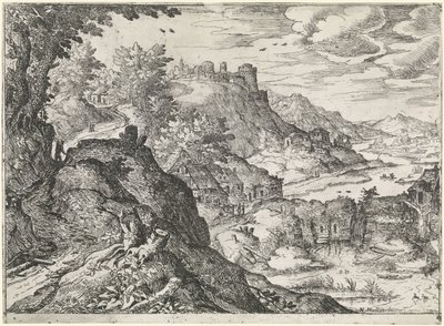 Venus trauert um den Tod von Adonis Landschaften mit biblischen und mythologischen Szenen (Serientitel)(Venus treurt over de dood van Adonis Landschappen met bijbelse en mythologische scènes (series title))Hieronymus Cock(print maker),Matthys Cock(after design by),Hieronymus Cock(publisher) |