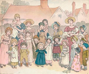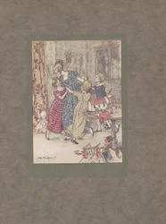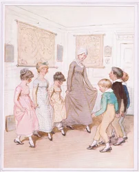 Miss Phoebe gibt eine Tanzstunde für ein halbes Dutzend Schüler und gibt ihr Bestes(Miss Phoebe is giving a dancing lesson to half a dozen pupils, and is doing her very best. )Hugh Thomson |