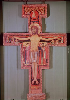 damiano · gekreuzigt · jesus christus · lendenschurz · heiligenschein · engel · engel · jungfrau maria · joseph · kreuzigung · mittelalterlich · byzantinisch · Santa Chiara, Assisi, Umbria, Italy / Bridgeman Images