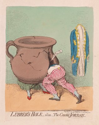 Lubber's-Hole, alias, The Crack'd Jordan, veröffentlicht von Hannah Humphrey 1791 (handkolorierte Radierung)(Lubber's-Hole, alias, The Crack'd Jordan, published by Hannah Humphrey in 1791 (hand-coloured etching))James Gillray |