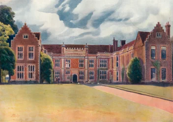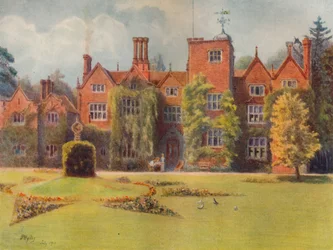natur · draußen · abhang · baum · gebäude · gebäude · england · haus · wand · landschaft · garten · betrieb · land · hecke · englisch · farbe · farbe · grafschaft · boden · rasen · im garten arbeiten · position · jahrhundert · gärtner · rasenmähmaschine · surrey · mähen · watercolour · landhaus · 17. jahrhundert · prächtiges haus · im garten arbeitende ausrüstung · 1910s · 20. jahrhundert · old house · watercolour · mickleham · james s ogilvy · ogilvy · james s · george routledge sons limited · The Print Collector/Heritage Images |