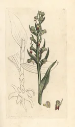 Fliegen-Ragwurz, Ophrys insectifera. Handkolorierter Kupferstich nach einer Illustration von James Sowerby aus James Smiths English Botany, London(Fly orchid, Ophrys insectifera (Fly orchis, Ophrys muscifera). Handcoloured copperplate engraving after an illustration by James Sowerby from James Smith's English Botany, London)James Sowerby |