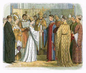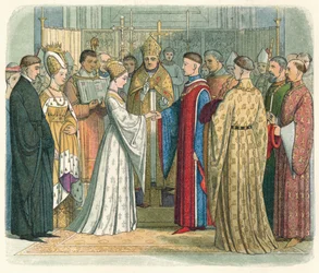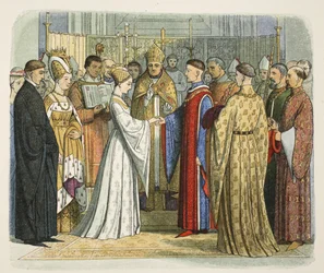 Hochzeit von Heinrich V. und Katharina von Frankreich, 2. Juni 1420, aus 'A Chronicle of England BC 55 to AD 1485', veröffentlicht in London, 1863(Marriage of Henry V and Katherine of France, 2 June 1420, from A Chronicle of England BC 55 to AD 1485, pub. London, 1863 )James William Edmund Doyle |