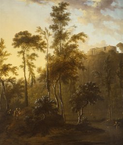 Bewaldete Berglandschaft mit Reisenden auf einem Weg, eine Villa dahinter(Wooded mountainous landscape with travelers on a track, a villa beyond)Jean-Francois Millet |