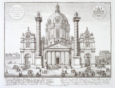 Kirche des Heiligen Karl Borromäus (1538-84), Wien, aus 'Entwurf einer historischen Architektur', graviert von Johann Adam Delsenbach (1687-1765), 1721(Church of St. Charles Borromeo (1538-84), Vienna, from 'Entwurf einer historischen Architektur', engraved by Johann Adam Delsenbach (1687-1765), 1721 )Johann Bernhard Fischer von Erlach |