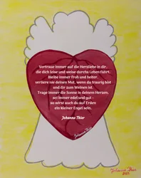 "Vertraue immer auf die Herzliebe in dir, die dich leise und weise durchs Leben führt. Bleibe immer froh und heiter, verliere nie deinen Mut, wenn du traurig bist und dir zum Weinen ist. Trage immer die Sonne in deinem Herzen, sei immer edel und gut - so wirst auch du auf Erden ein kleiner Engel sein."