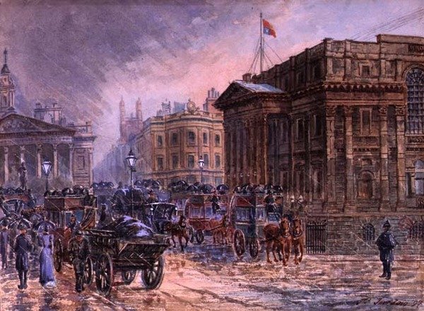 kutsche · pferd · pferde · tier · tiere · tierwelt · nutztier · vieh · regen · regen · meteorologie · wetter · klima · wissenschaft · straße · offen · hauptverkehrszeit · victoria · regen · polizist · kutsche · verkehr · regenschirm · pferd · omnibus · malerei · MzMalerei · Private Collection / Bridgeman Images |