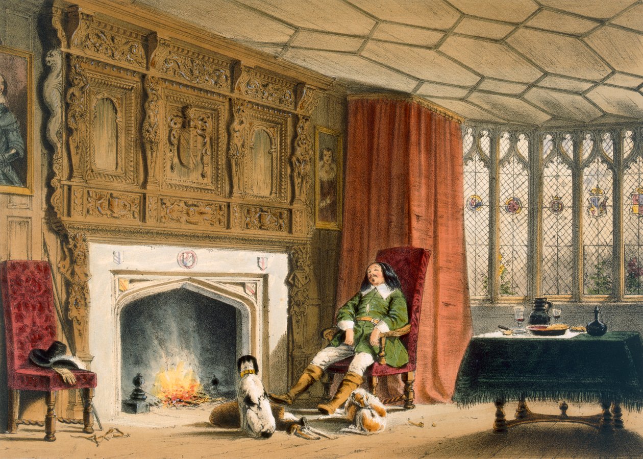 interieur · herrenhaus · herrenhaus · feuer · kamin · männchen · schlafen · ruhen · entspannen · hund · haustier · haustiere · geschnitzt · eichenvertäfelung · verziert · schnitzen · holz · landhaus · tisch · krug · wein · fenster · glas · Private Collection / Bridgeman Images |
