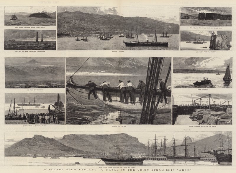 reise · england · natal · union steam ship arab · cima island · madeira group · porto santo · eddystone leuchttürme · funchal · madeira · loch · wand · st. john' · s river · loo rock · gipfel von teneriffa · kauf · obst · biegen · marssegel · port elizabeth · sonntag morgen muster · besatzung · kapstadt · tafelberg · table bay docks · löwenkopf · maritime · Private Collection / Bridgeman Images · / Look and Learn |